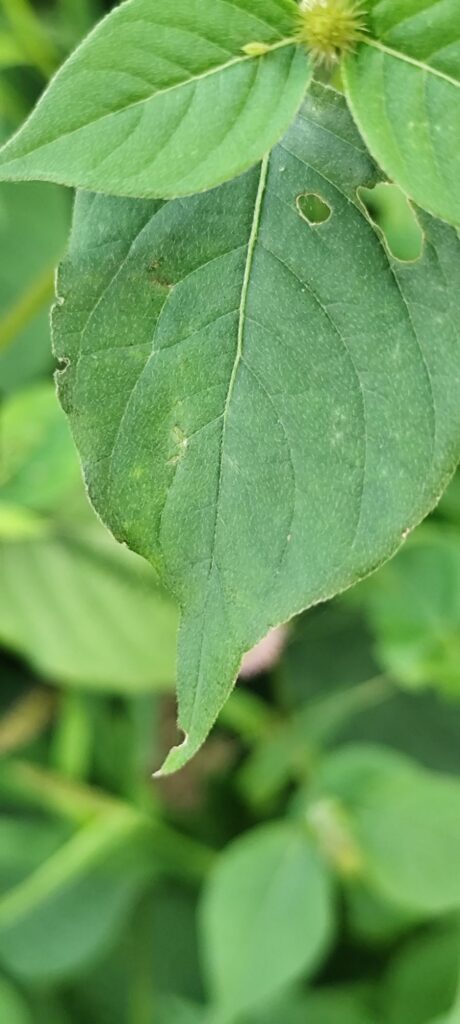 The leaves are opposite, oval to elliptical, and medium green in color. Small greenish flowers are produced in long, slender spikes with stiff bracts that give the plant its common name.