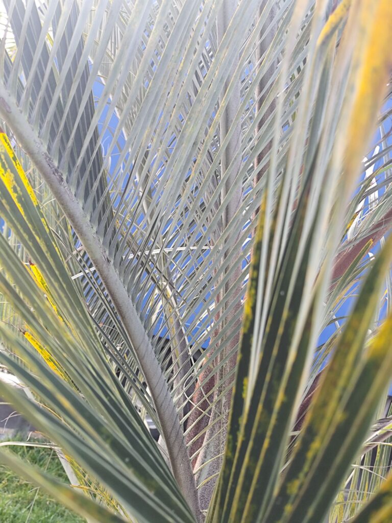 The leaves are long, arching, and feather-like, with a silvery-green to blue-green tone. The crown is open and airy, enhancing the palm’s elegant appearance.