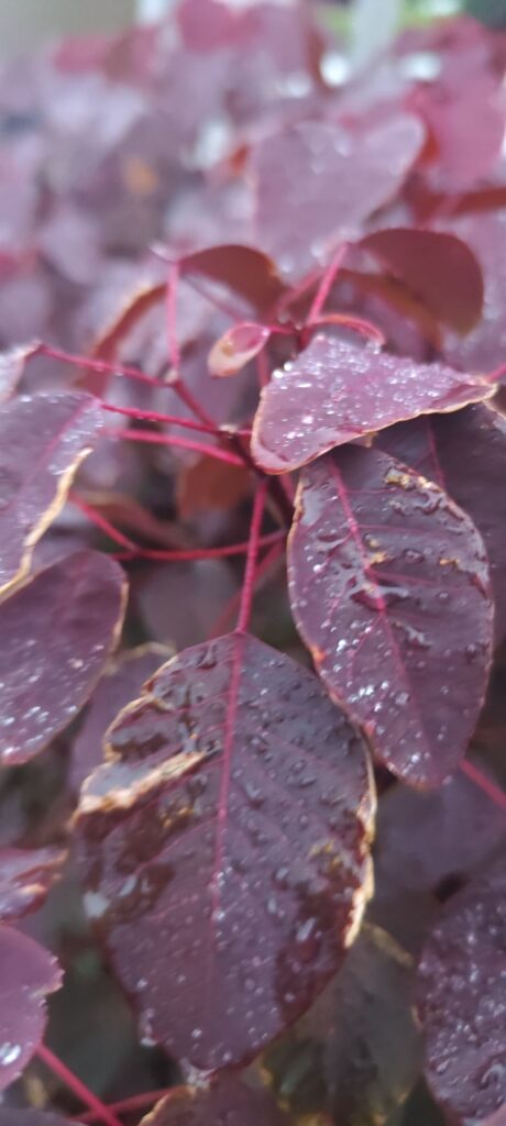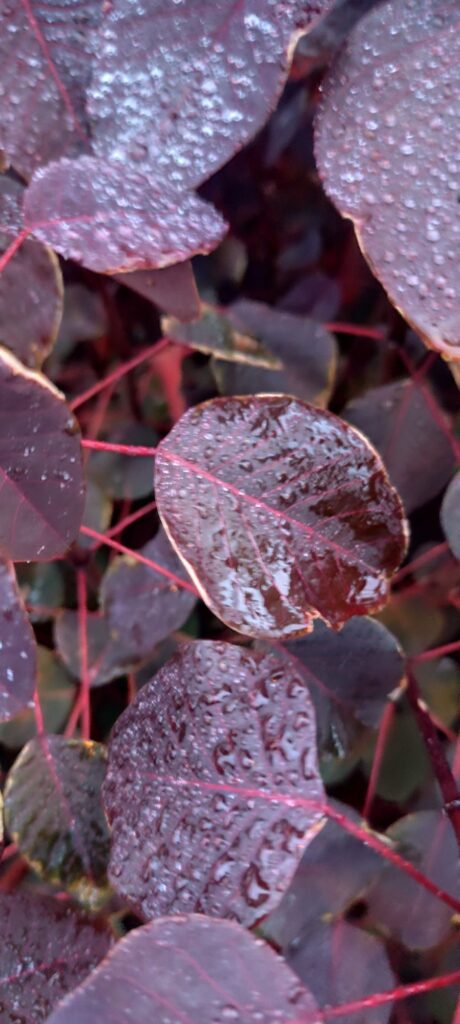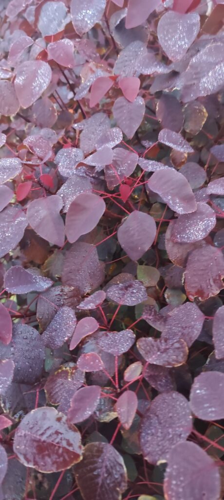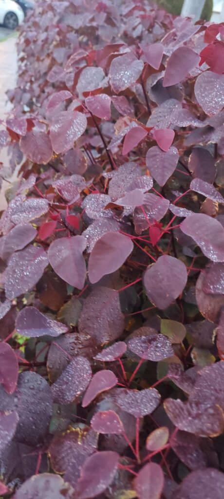This plant develops as a large shrub or small tree with a rounded to spreading canopy. The leaves are oval to slightly elongated and display intense burgundy, copper-red, or purple coloration.