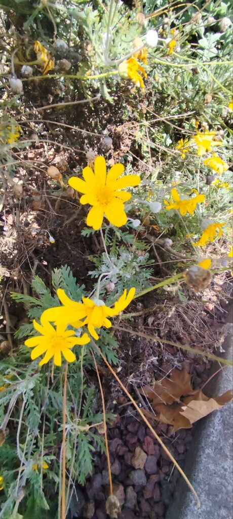 The flowers are bright yellow, daisy-like, and produced abundantly on long stems above the foliage, creating strong visual contrast.