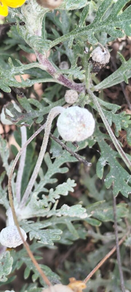 This plant forms a rounded, bushy shrub with finely divided, grey-green leaves that give it a soft, silvery appearance.