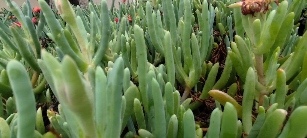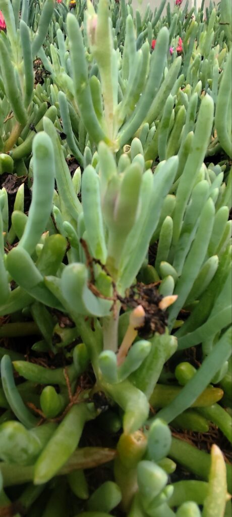 This species forms dense mats of creeping stems covered with fleshy, cylindrical to slightly flattened leaves. The leaves store water, allowing the plant to survive extended dry periods.