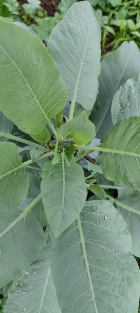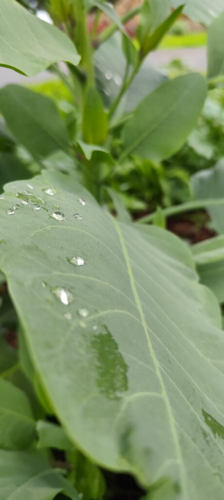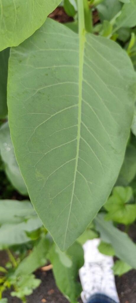 The leaves are large, oval to lance-shaped, and bluish-green with a soft, waxy surface.