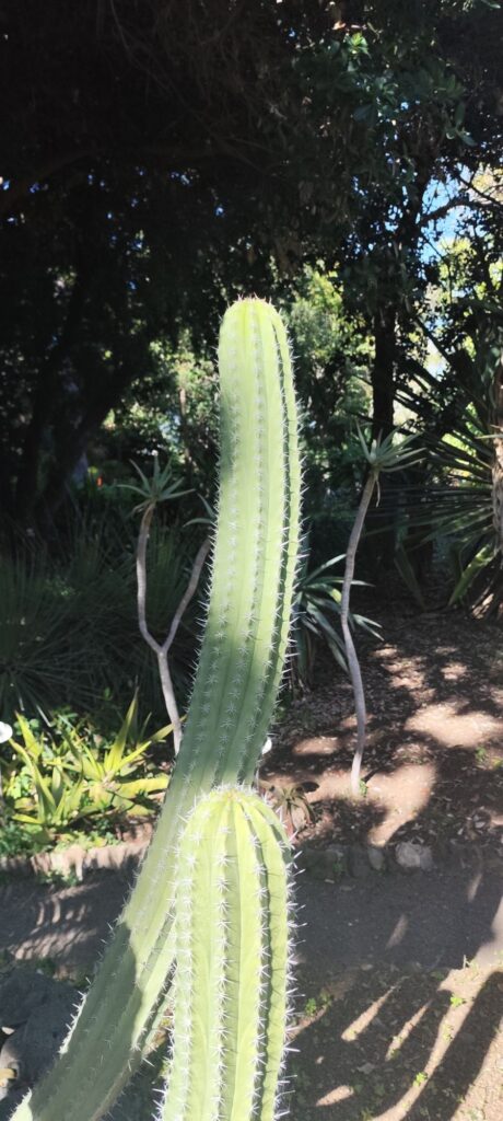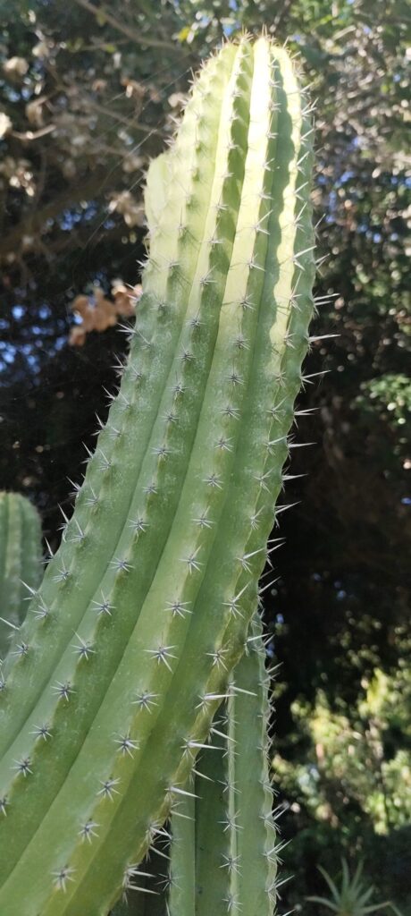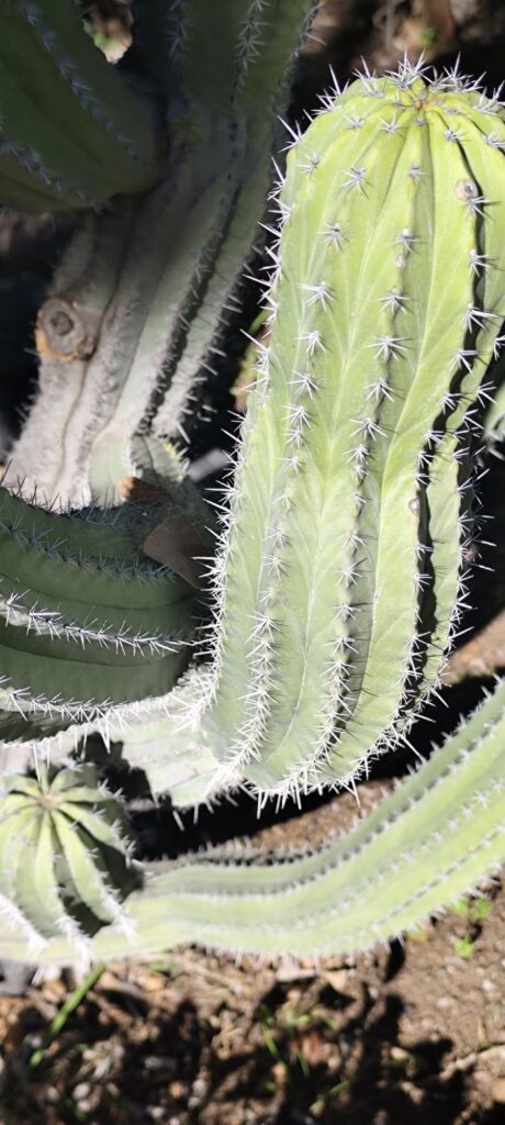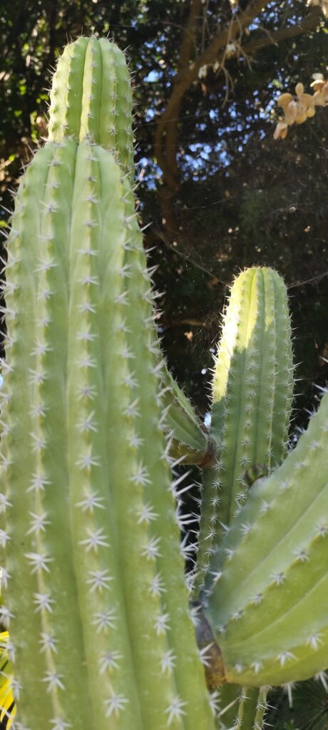 This cactus grows as a columnar, tree-like plant that branches extensively from the base or upper stems. Over time, it can form a dense, candelabra-shaped structure.