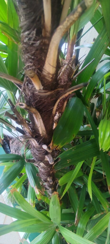 Rhapis excelsa has a slow growth rate and gradually produces new shoots from the base, forming a dense, multi-stemmed clump.