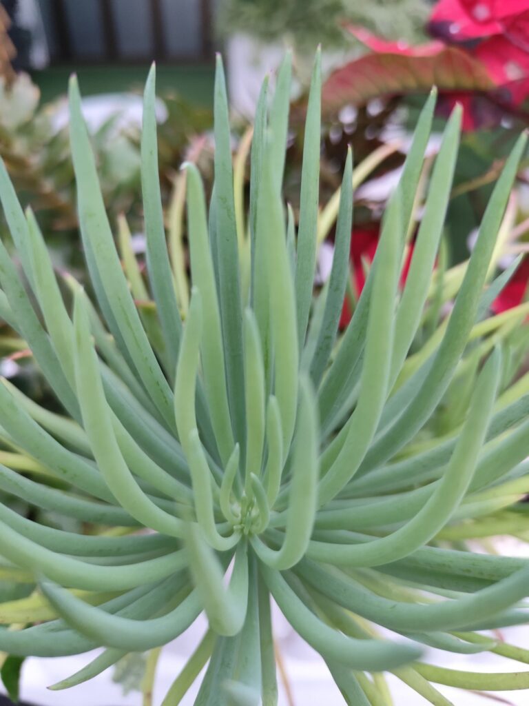 This species forms upright to slightly spreading clumps composed of cylindrical, elongated leaves resembling sticks or fingers. The leaves are smooth, fleshy, and typically display a blue to blue-green color, often enhanced by full sun exposure.