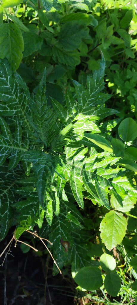 This plant forms a large basal rosette of glossy green leaves marked with distinctive white marbling. The leaves are deeply lobed and armed with sharp spines along the margins.