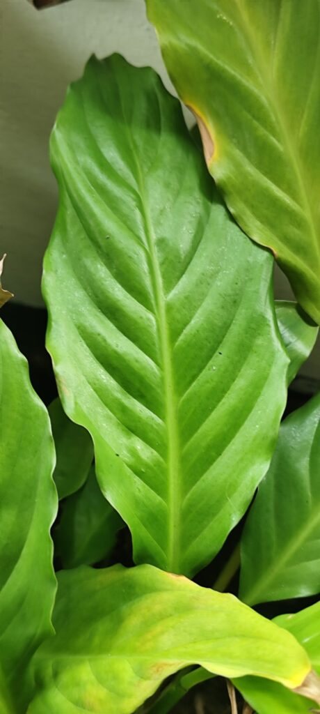 Spathiphyllum thrives in warm, humid environments and prefers low to medium indirect light. It tolerates low-light conditions better than many flowering plants.