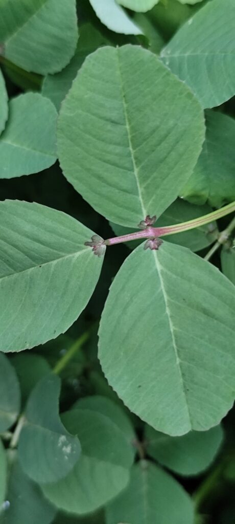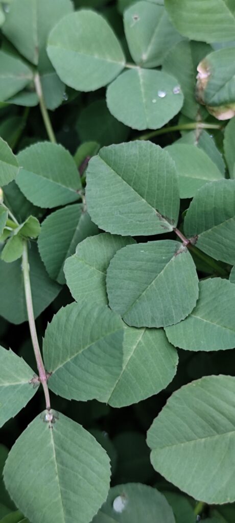 The leaves are composed of three rounded leaflets, often marked with a pale crescent. The flowers are spherical heads made up of many small white to pale pink florets.